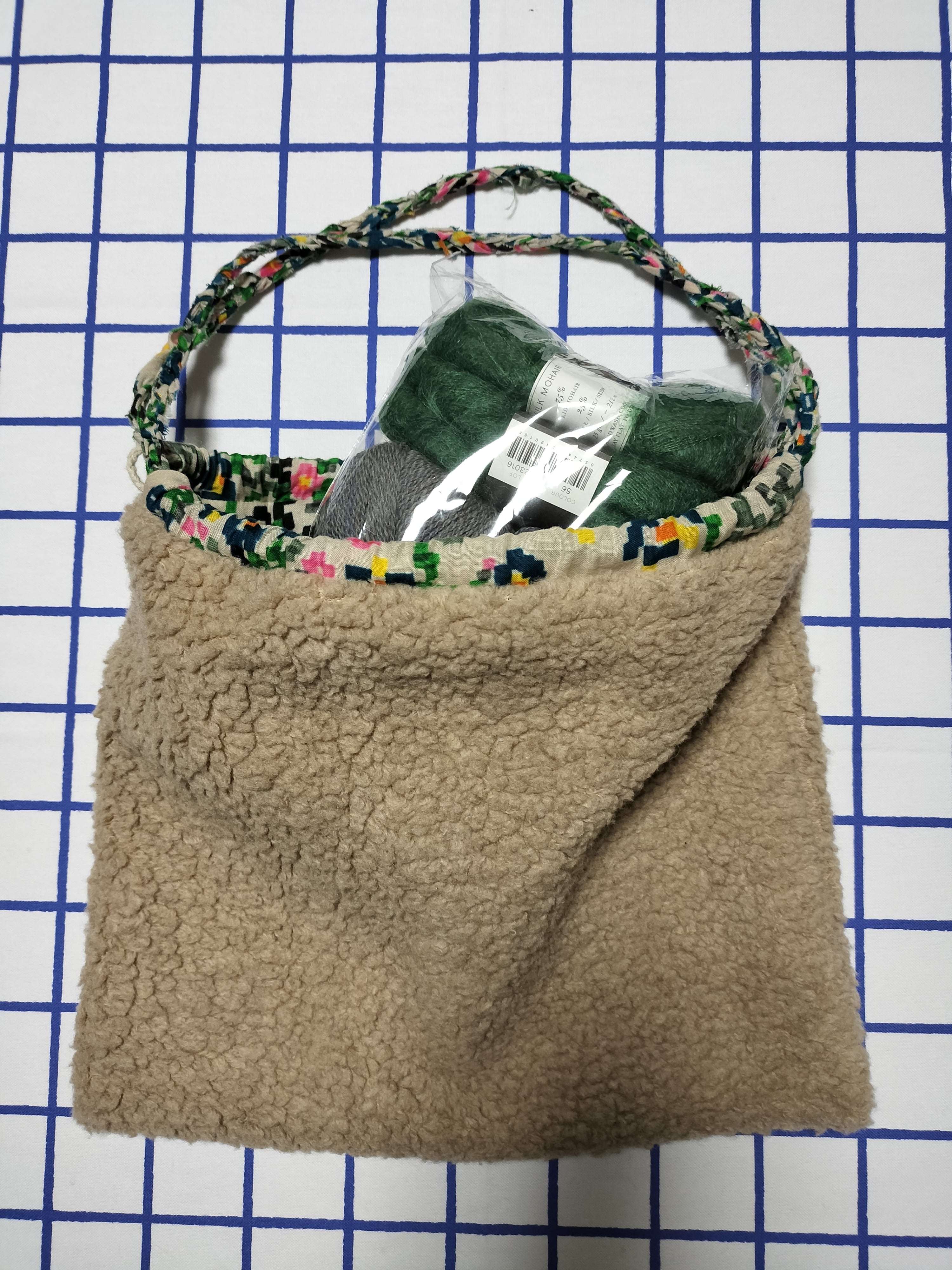 ひも通し部分は、別ヒモで若干の調整をする仕様、又、手さげ部分は共布を裂き、くさり編み