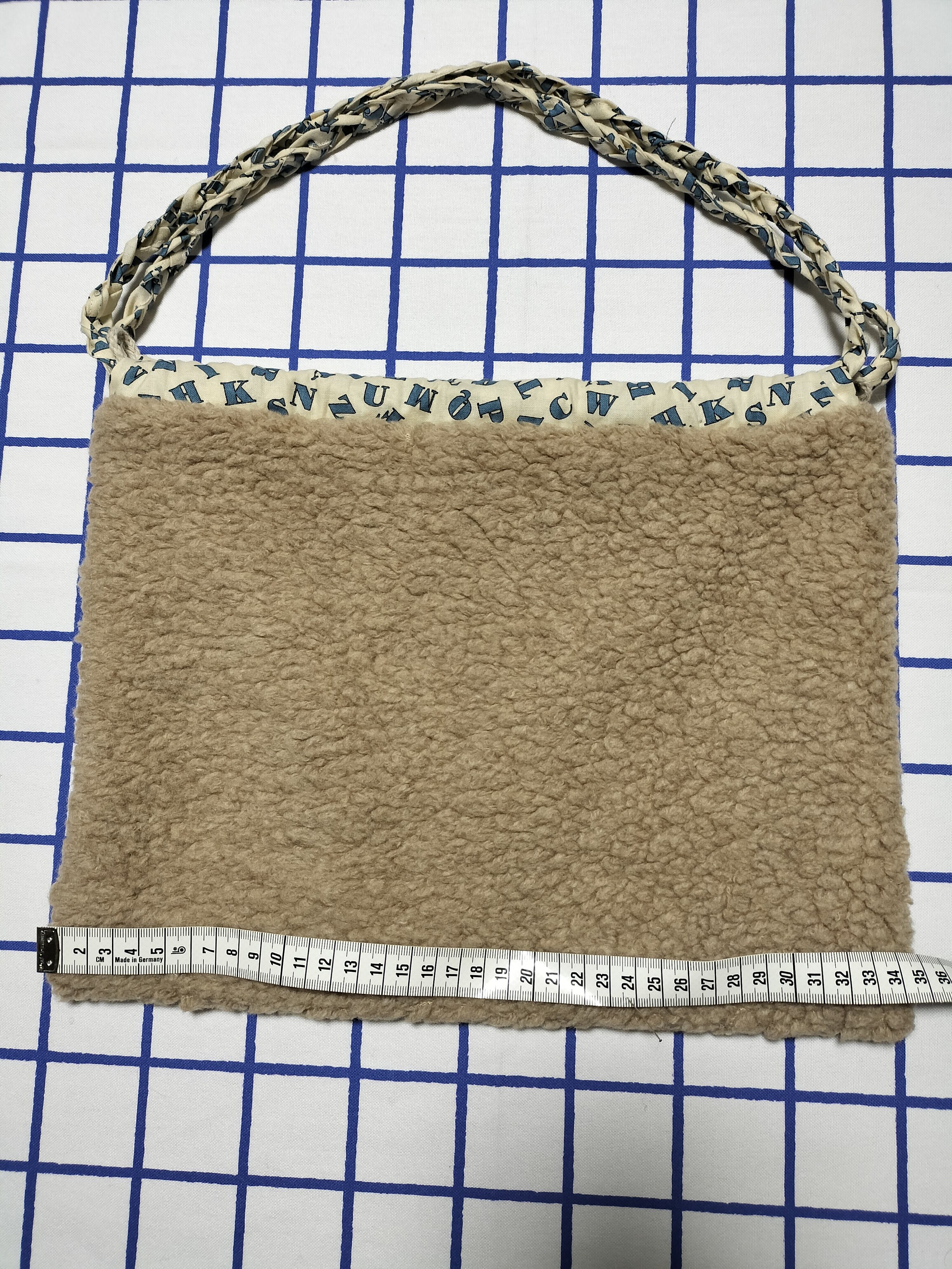 ひも通し部分は、別ヒモで若干の調整をする仕様、また、手さげ部分は共布の三つ編みになっています♡