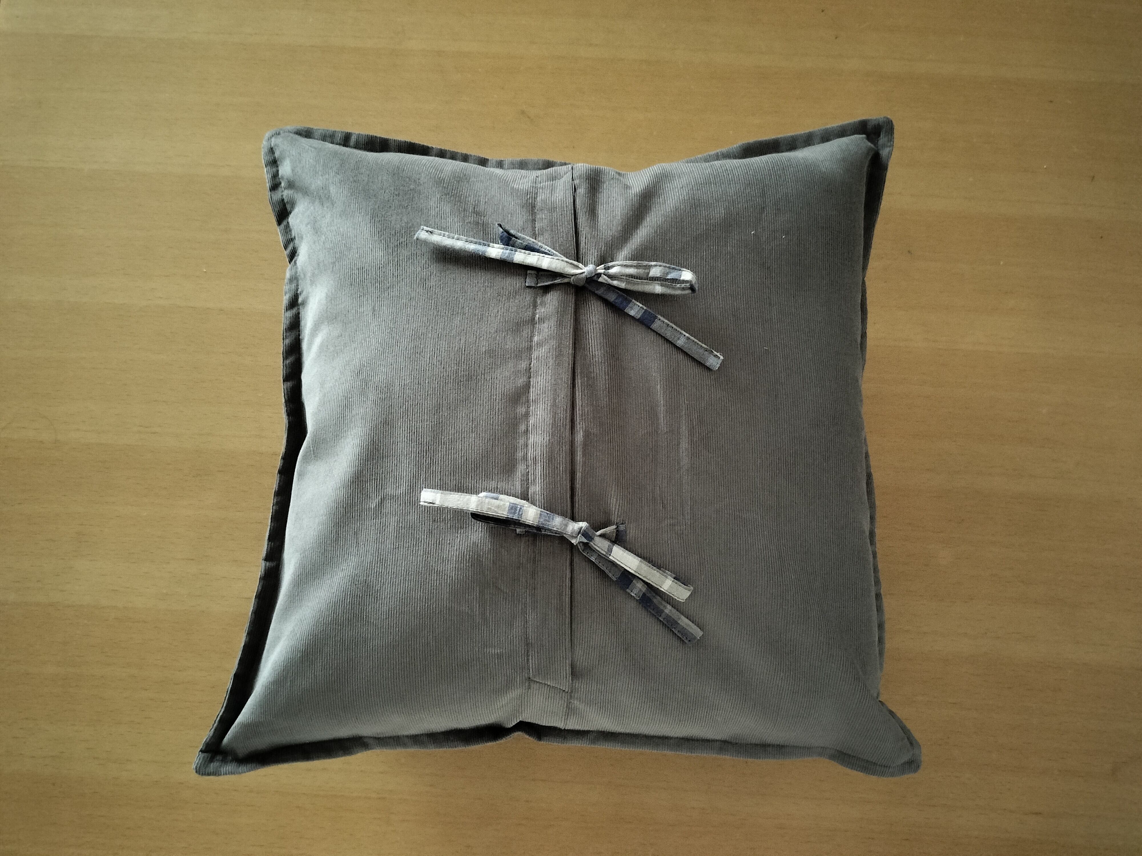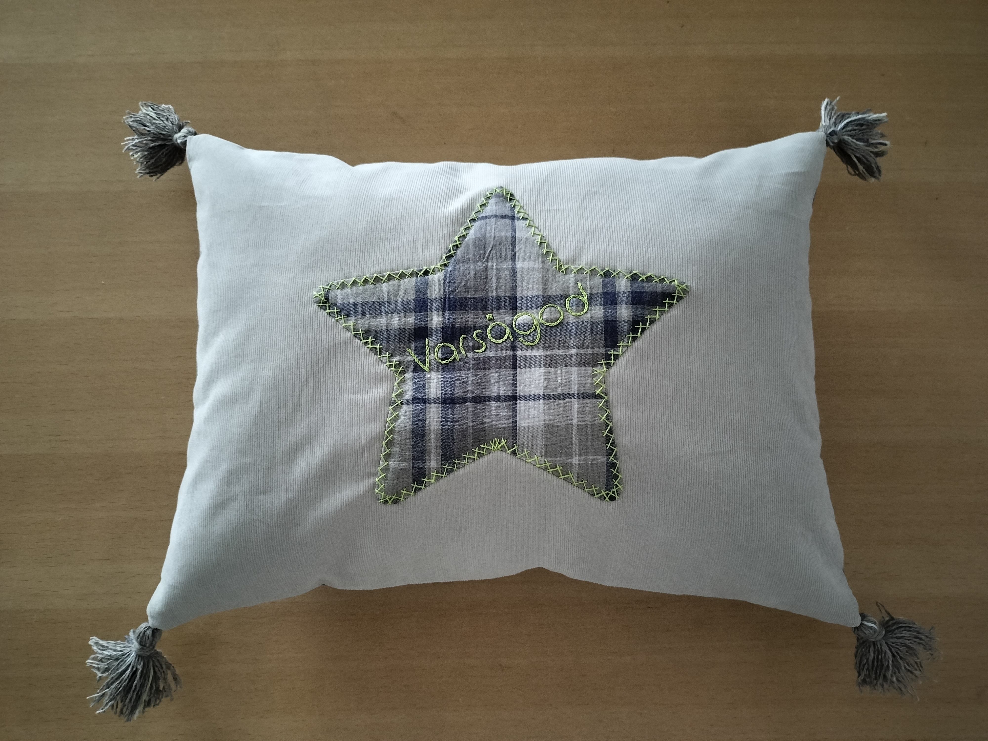 様々な場面で使われる、スウェーデン語 Varsågod! と LAGOM のロゴと、縁取り刺繍を入れたミニクッション。